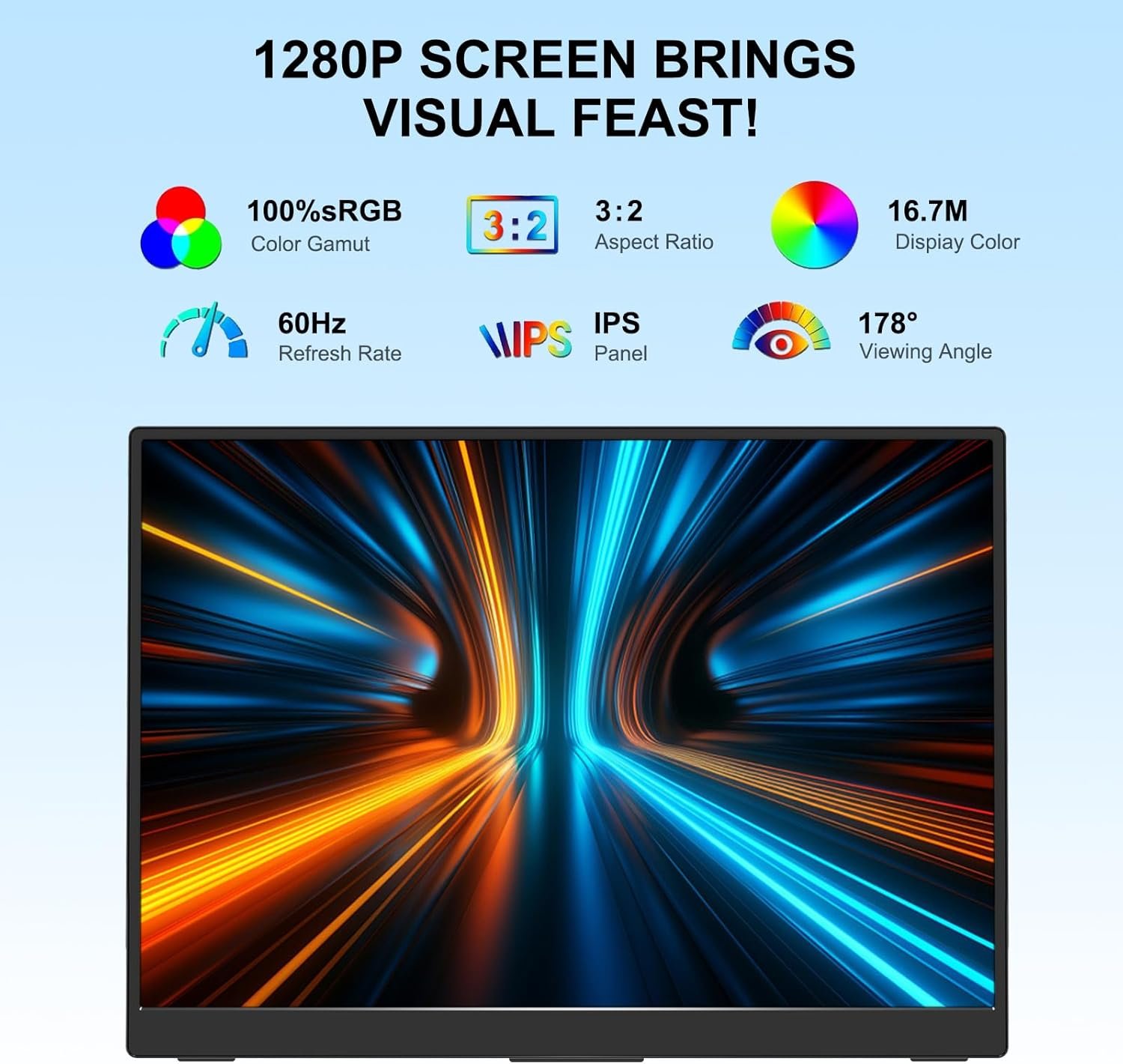- 【FHD IPS 顯示器具有驚人清晰度】:便攜式顯示器採用 IPS 螢幕顯示技術,內建 1920×1280 像素 LCD 螢幕。178 度視角為您提供更生動的圖像和細節。使用者感受多種視角的美麗。高達 100% RGB 和 500Nit 像素,同時為使用者提供更清晰、更流暢的畫面。